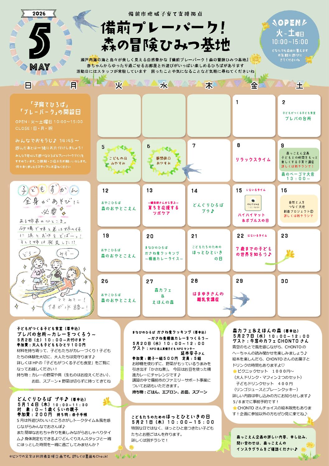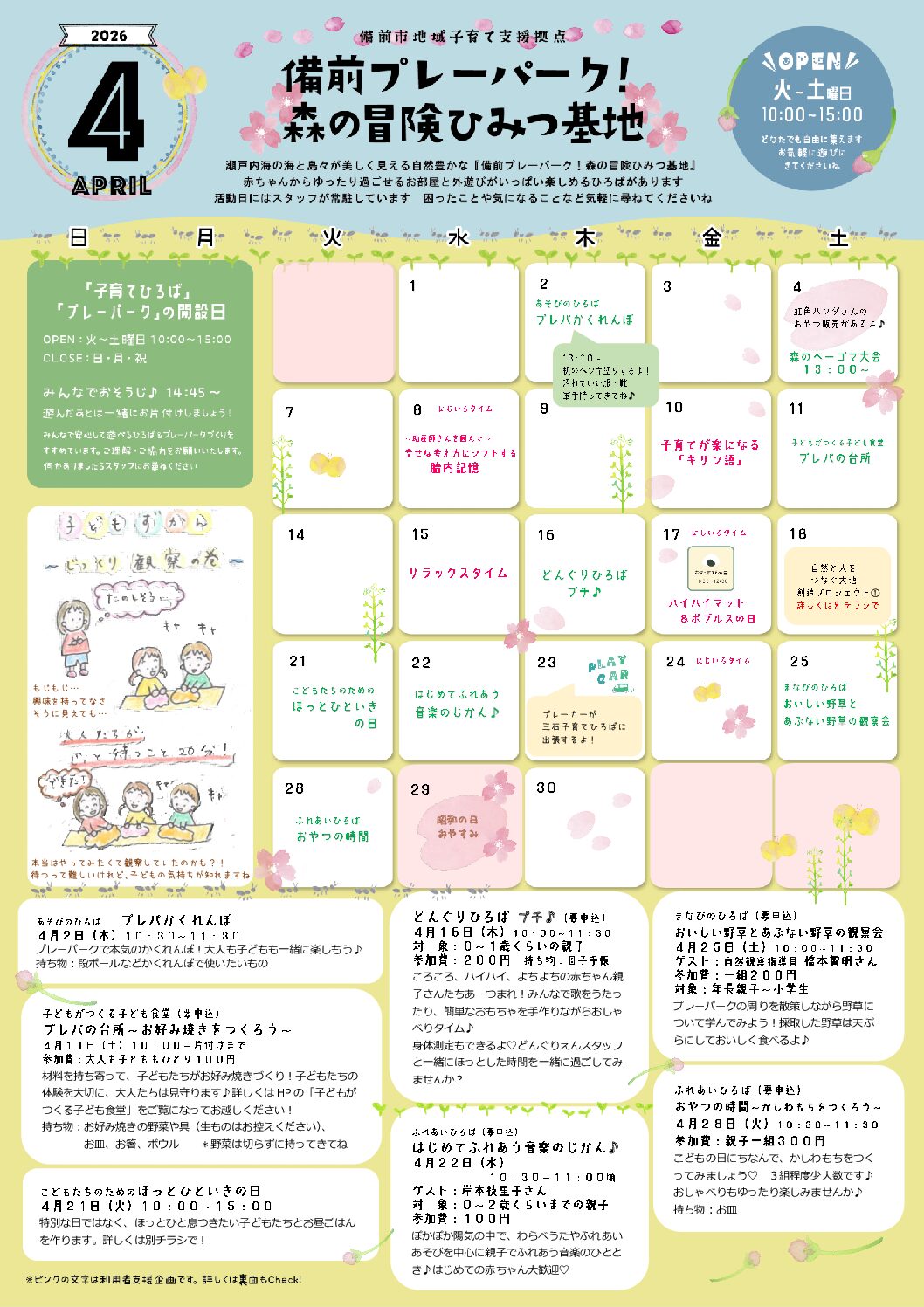 プレーパーク・子育て支援拠点開設日:火~土曜日 10時~15時